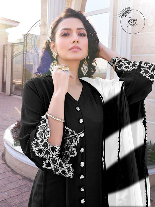 Elegant Black Embroidered Kurta with Floral Dupatta unique