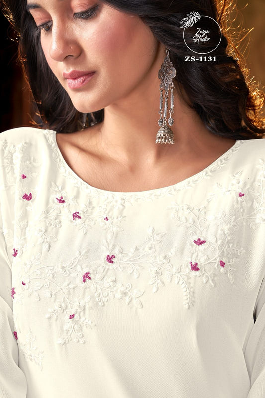 Designer stylish Embroidery Tunic With Pearl Moti With Stylish Neck Pattern & also Embroidery In Sleeves with Glamours Gorgeous Looking In Kurti paired with Bottom & Embroidered Organza Dupatta